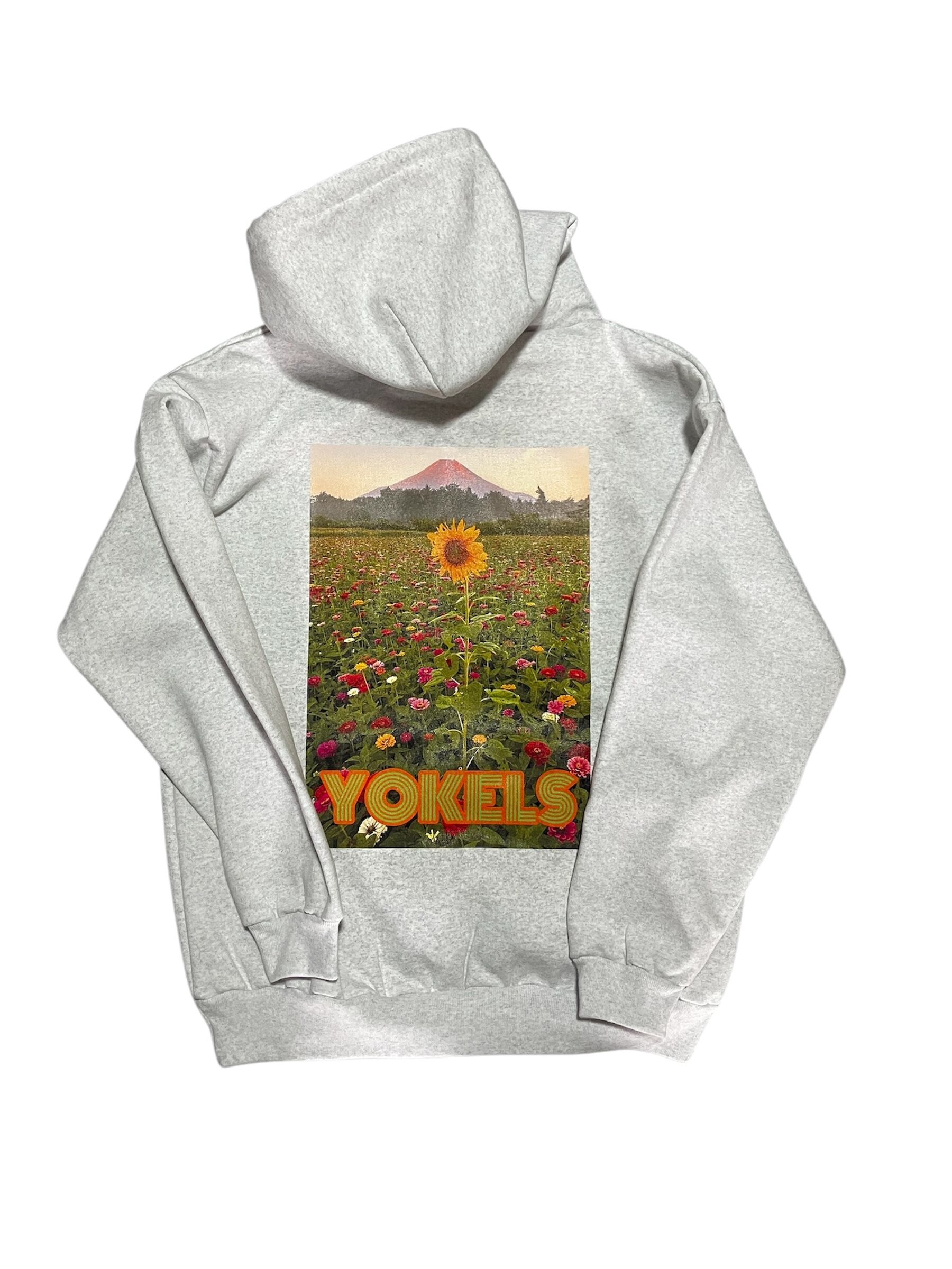 フロントデザインはYOKELSロゴの刺繍加工。バックプリントは富士山とお花畑に一輪のミラクルひまわり。ひまわりの鮮やかなデザインがあなたの日常に彩りを加え、見るたびに元気をもらえること請け合いです。この商品が、あなたのライフスタイルに華やかさをプラスしてくれることでしょう。